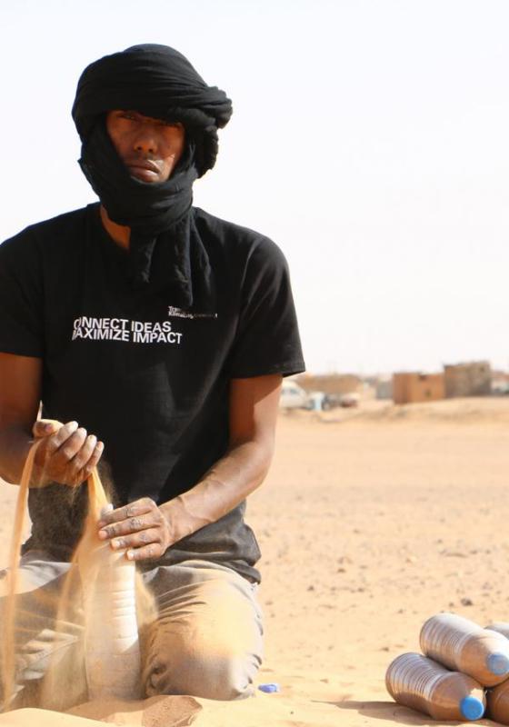 Consiguió estudiar Energías Renovables gracias a una beca de ACNUR y, tras dar muchas vueltas a cómo construir refugios aislantes del calor en medio del desierto del Sáhara con los medios a su alcance, se le ocurrió una solución que le llevó a ser conocido como “el loco del desierto”: construir casas con botellas de agua.