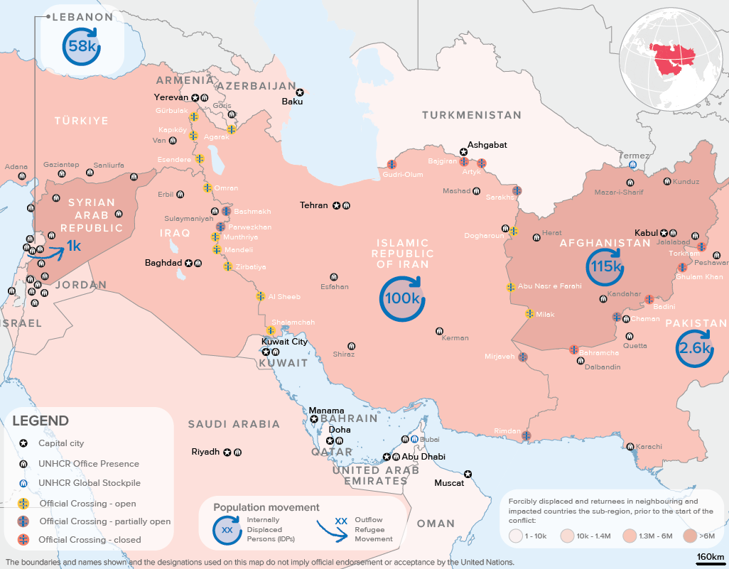 En Irak, los pasos fronterizos de Bashmakh y Parwezkhan restringen actualmente la entrada a ciudadanos iraníes. Según los procedimientos actualizados, solo los iraquíes que ya se encuentran en Irán pueden regresar a Irak, y solo los iraníes que ya se encuentran en Irak pueden regresar a Irán. Otros cruces fronterizos entre Irán e Irak en las gobernaciones central y meridional permanecen abiertos. ACNUR sigue la situación en coordinación con las autoridades, sin cambios significativos por ahora, pero listo para asistir a nacionales iraníes y refugiados afganos si fuera necesario.